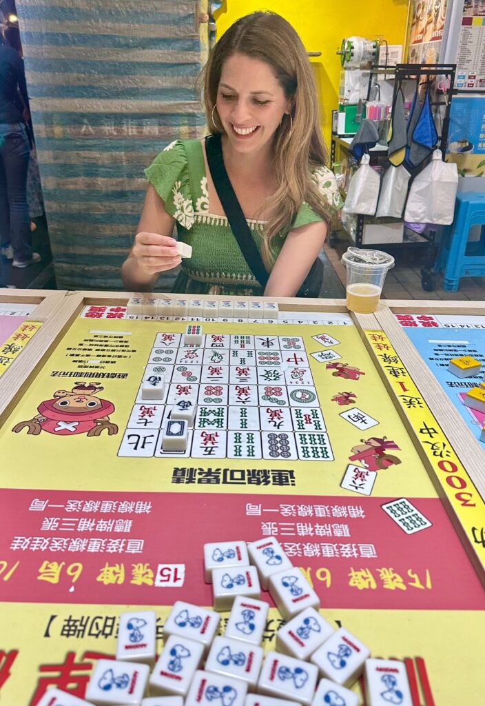 At the Raohe Night Market, I also saw a booth with Mahjong bingo and had to give it a try! Basically you choose 15 tiles and then flip them over to see if they match the Mahjong markings on your board. I, of course, had to choose the Snoopy tiles and it brought me luck; I won on my first try!