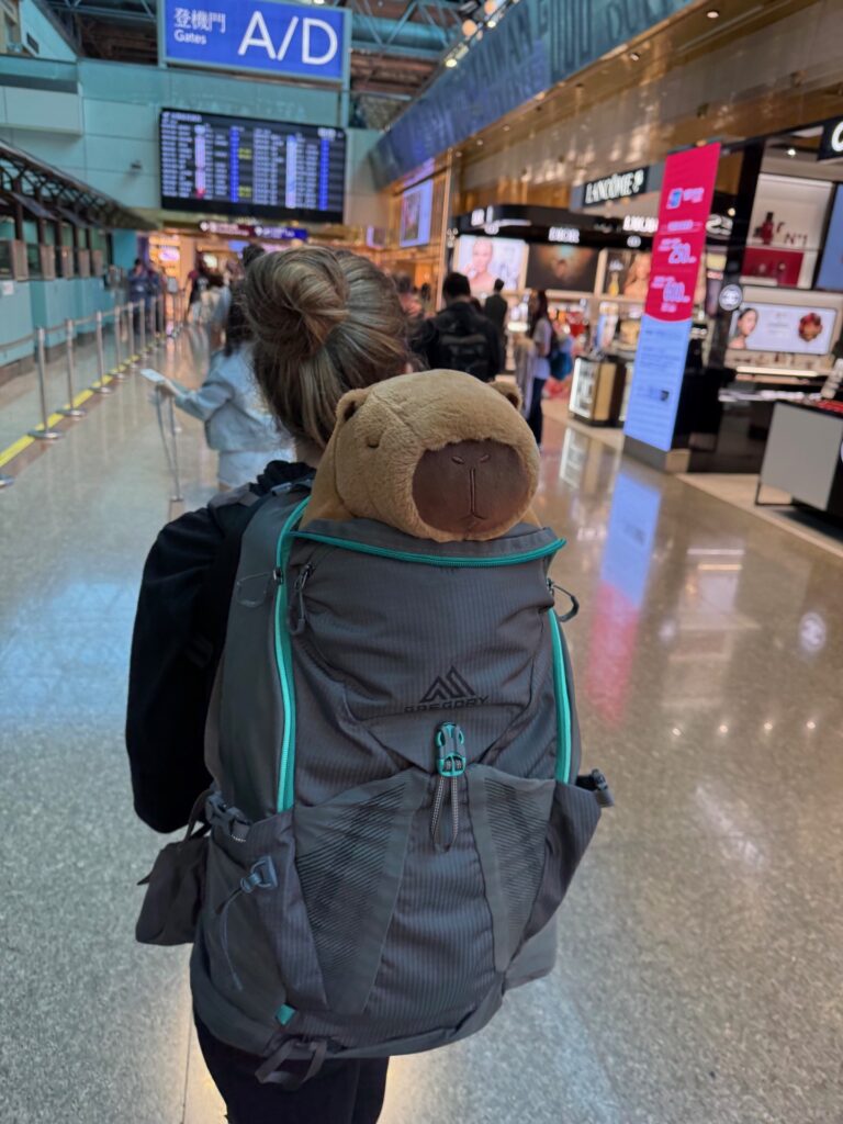 I named my stuffed prize Happybara the Capybara and he got to travel across the world with me on my way back to the U.S.!